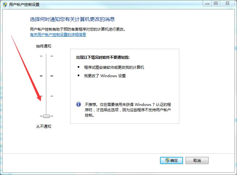9. 因涉及到 windows 系統(tǒng)安全性,請修改更改用戶賬戶設(shè)置的通知級別到最低。