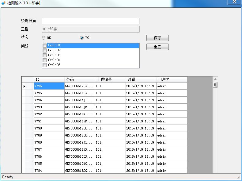 10:檢測輸入界面,問題可以在數(shù)據(jù)庫中設(shè)置,此界面用于 NG 條碼的輸入,問題選擇可以用于后續(xù)的匯
