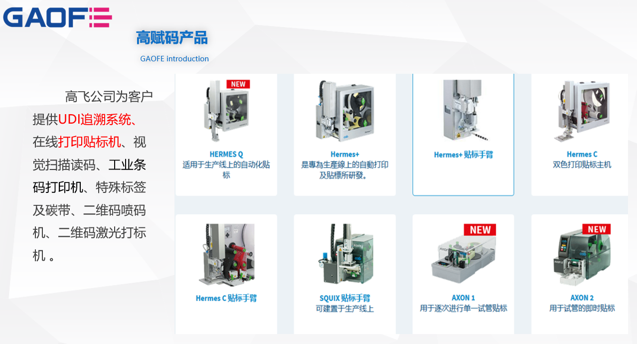 高賦碼專為高端貼標(biāo)提供解決方案,提供包括硬件、軟件、耗材的整體解決方案,幫助企業(yè)提高效益、節(jié)省人工。