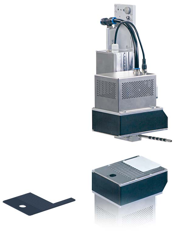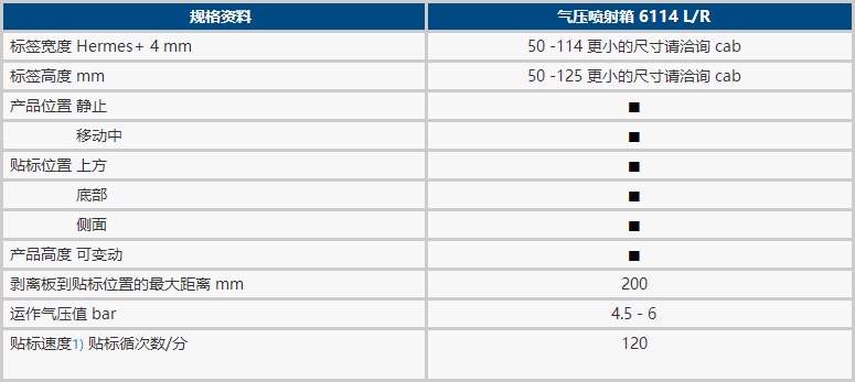 借由風(fēng)扇吸取標(biāo)簽并利用強力的噴射氣流經(jīng)由調(diào)整過的噴嘴吹貼標(biāo)簽。依據(jù)標(biāo)簽尺寸,自產(chǎn)品到剝離板的距離最大為 200 mm。