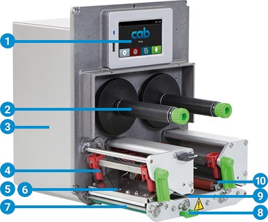標(biāo)簽剝離之后,下一張標(biāo)簽會(huì)退回打印頭后方。借此確保標(biāo)簽前緣仍可打印并防止殘膠因長時(shí)間等待而溢出。使用敏感材質(zhì)時(shí),打印頭可抬起以避免碳帶起皺折。