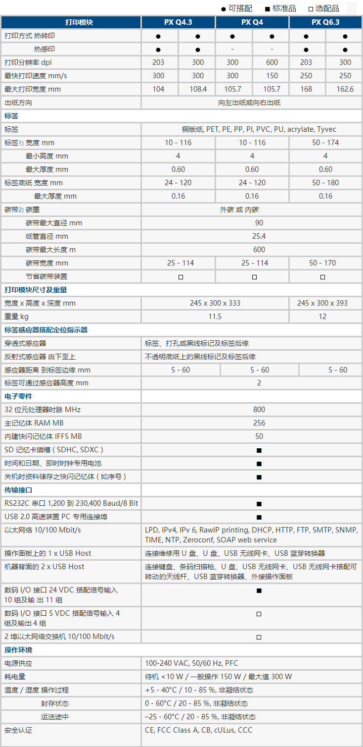所有打印模塊皆提供向左及向右出紙的版本。使用 PX Q4 時(shí)可選用 300 及 600 dpi 的打印分辨率。PX Q4.3 及 PX Q6.3 提供了 203 及 300 dpi 的選擇。