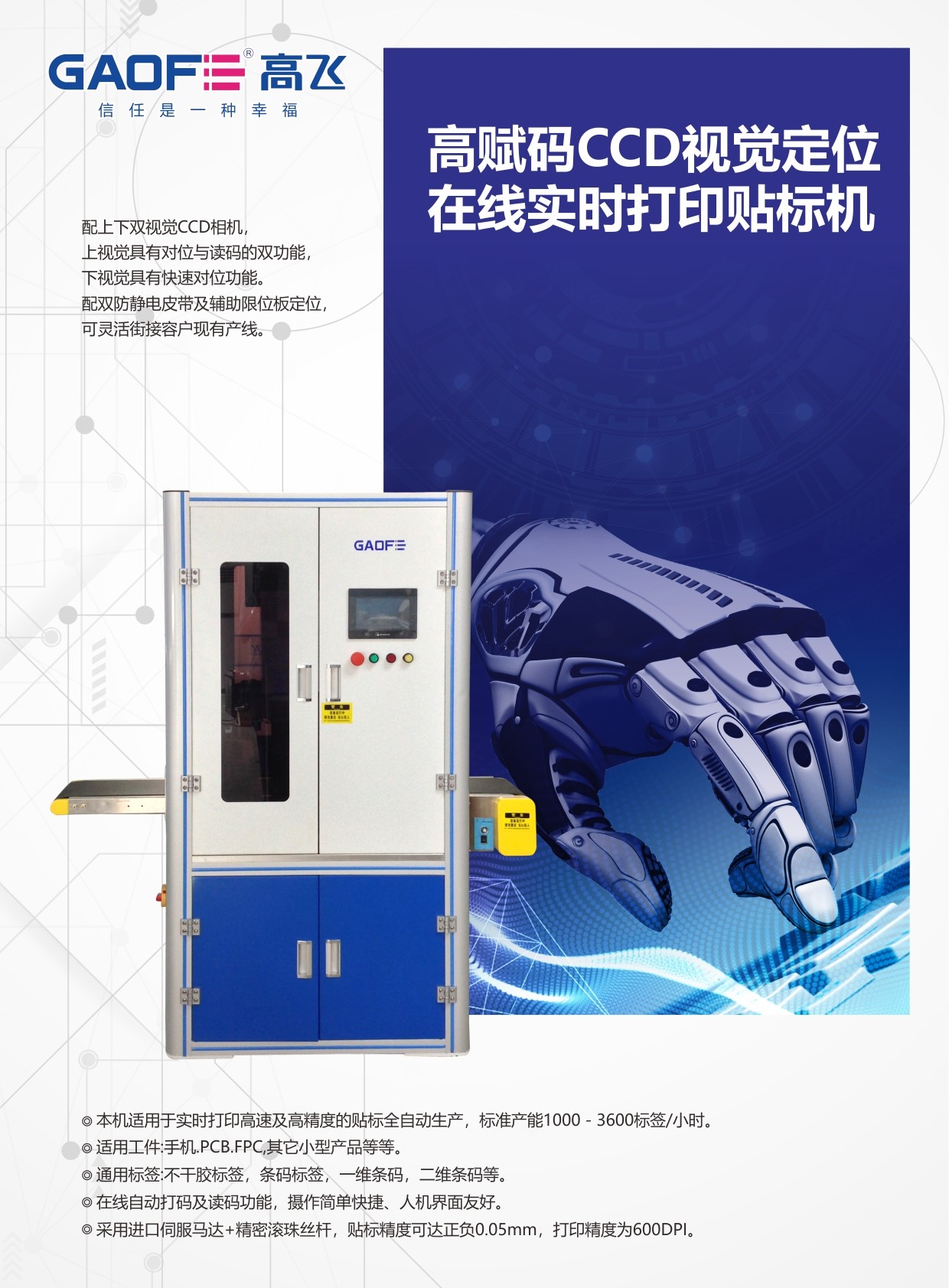 貼標(biāo)精度可達(dá)正負(fù)0.05mm,打印精度為600DPI.