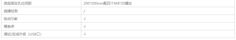支持碰撞檢測、拖動示教、硬急停、調(diào)試/在線升級(USB口)
